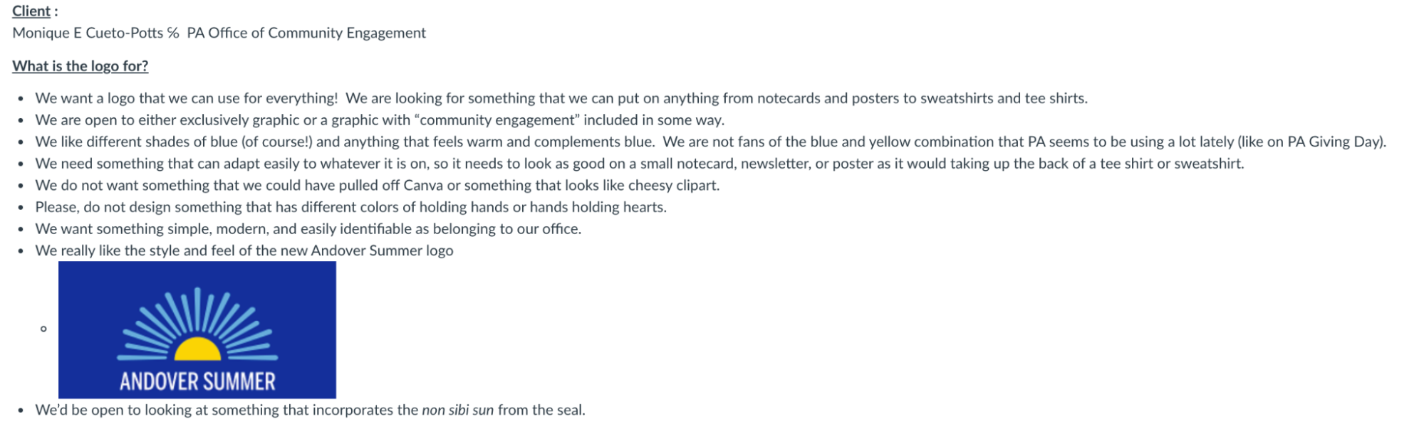 The client would like to have a logo that can be put onto different materials/merch. They would also prefer to have the logo match their main color scheme of blue and for us to avoid yellow. It has to be easily identifiable as the logo of the community engagement office and should be modern-looking.